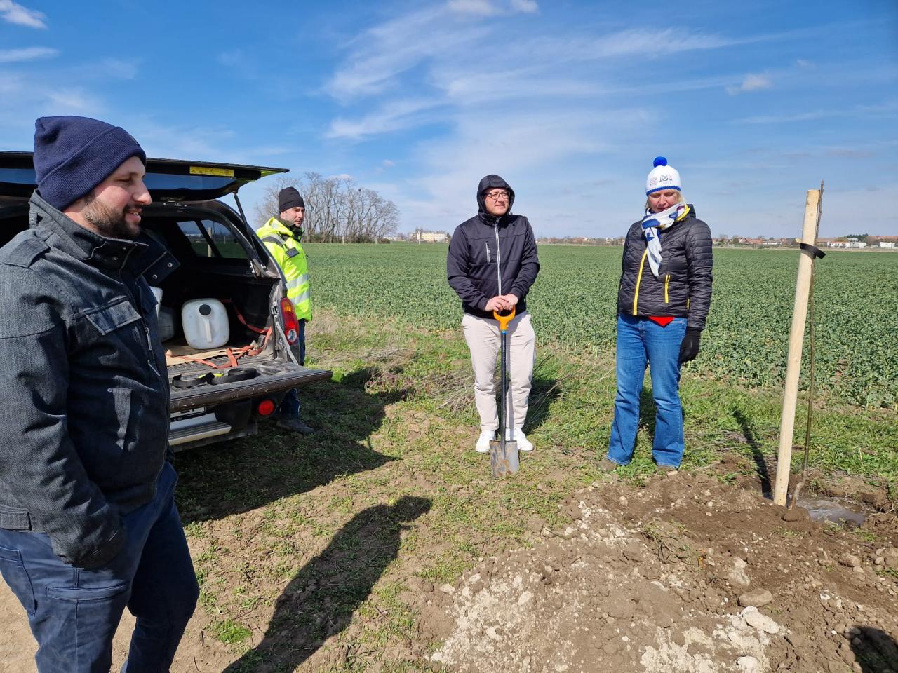 na pozemkoch obce. Tentoraz 10 ks stromov prišli vysadiť zo spoločnosti Porsche Slovakia. Pri výsadbe pomáhali bývalý a súčasný starosta a dobrovoľný hasiči.