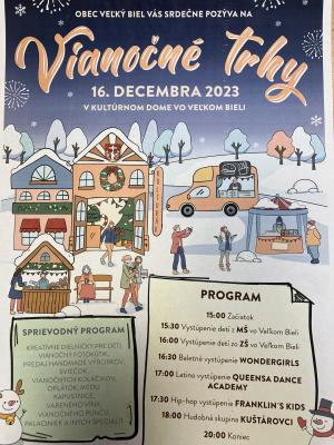 Obec Veľký Biel Vás srdečne pozýva na "Vianočné trhy", ktoré sa uskutočnia 16.12.2023 v kultúrnom dome vo Veľkom Bieli.