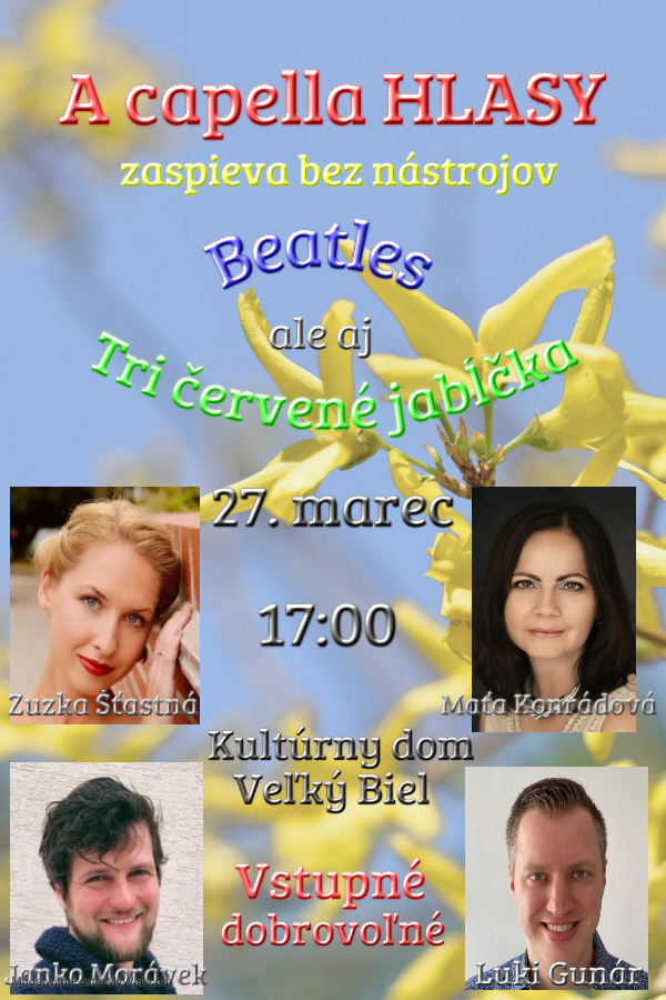 A capella HLASY vás srdečne pozývajú na koncert kde vám bez nástrojov zaspievajú piesne od Beatles, Queen ale aj slovenské ľudové piesne. Koncert sa uskutoční v nedeľu 27.3.2022 o 17.00 hodine v MKS vo Veľkom Bieli.