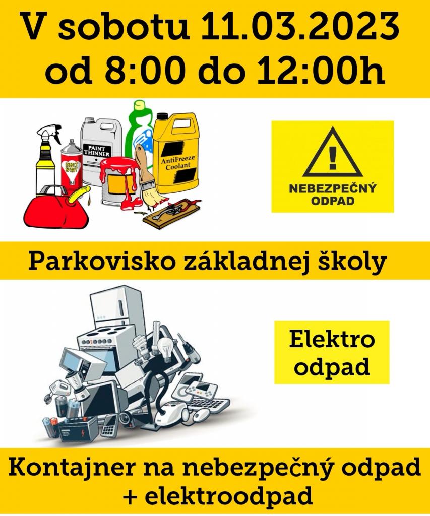 Oznamujeme občanom, že 11.3.2023 od 8.00 - do 12.00 hod. bude na Školskej ulici pri futbalovom štadióne pristavený kontajner na nebezpečný odpad a elektro odpad.