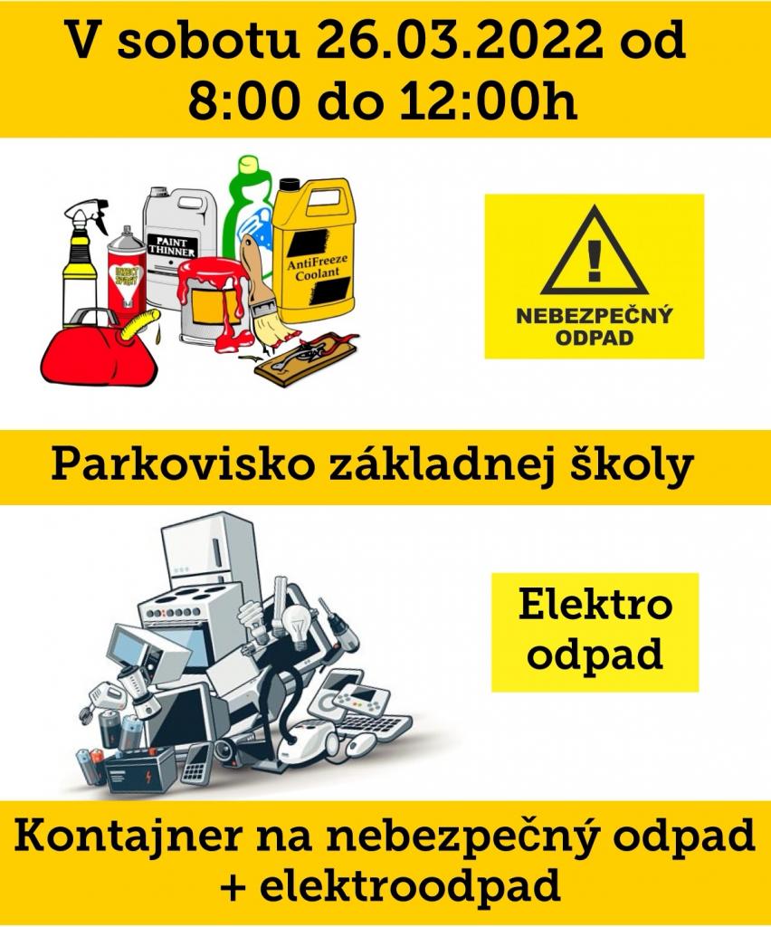 Oznamujeme občanom, že 26.3.2022 od 8.00 - do 12.00 hod. bude na Školskej ulici pri futbalovom štadióne pristavený kontajner na nebezpečný odpad a elektro odpad.