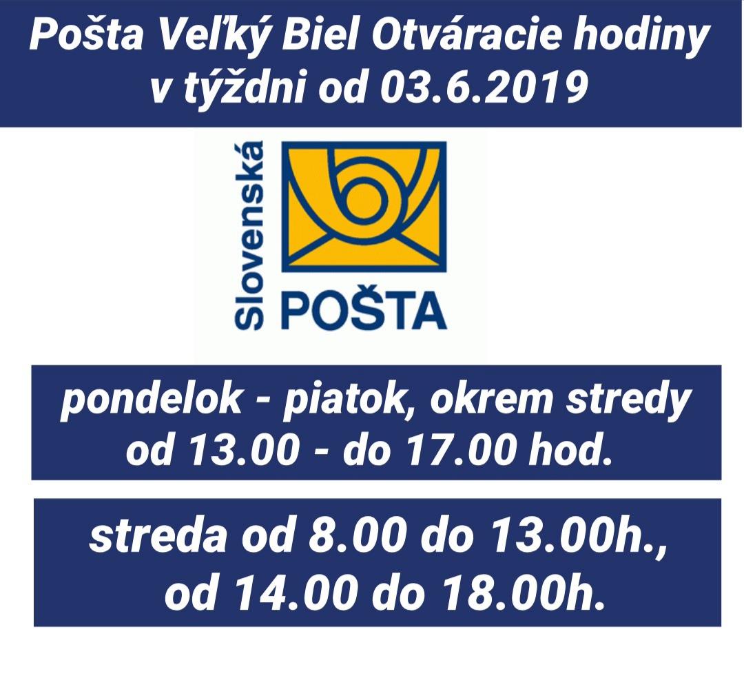Pošta Veľký Biel oznamuje, že od 3.6.2019 do 7.6.2019 bude otvorená nasledovne: pondelok: 13.00 - 17.00 hod. utorok: 13.00 - 17.00 hod. streda: 8.00 - 13.00 14.00 - 18.00 hod. štvrtok: 13.00 - 17.00 hod. piatok: 13.00 - 17.00 hod.