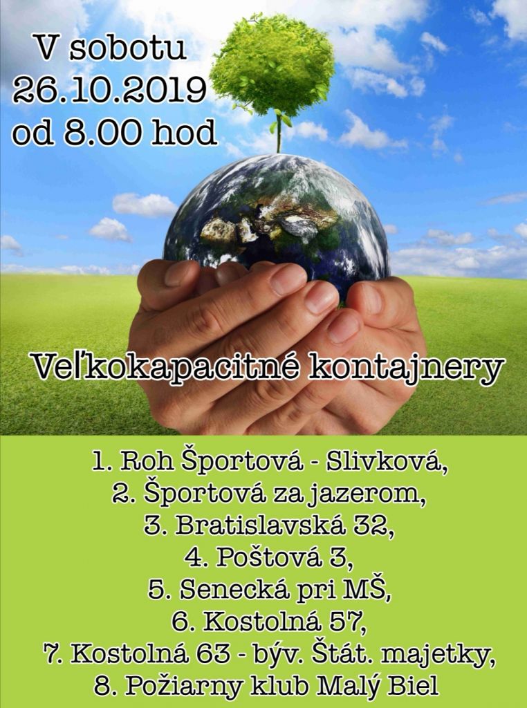 Oznamujeme občanom, že v sobotu 26.10.2019 od 8.00hod. budú pristavené veľkokapacitné kontajnery na drobný domový odpad na stanovištiach: Športová ul.(staré ihrisko), Bratislavská 32, Poštová 3, Požiarna zbrojnica(Malobielská), Kostolná 57, Kostolná 63 bytovky (pri ŠM), MŠ (Senecká ul)Pri jazere(na rohu)