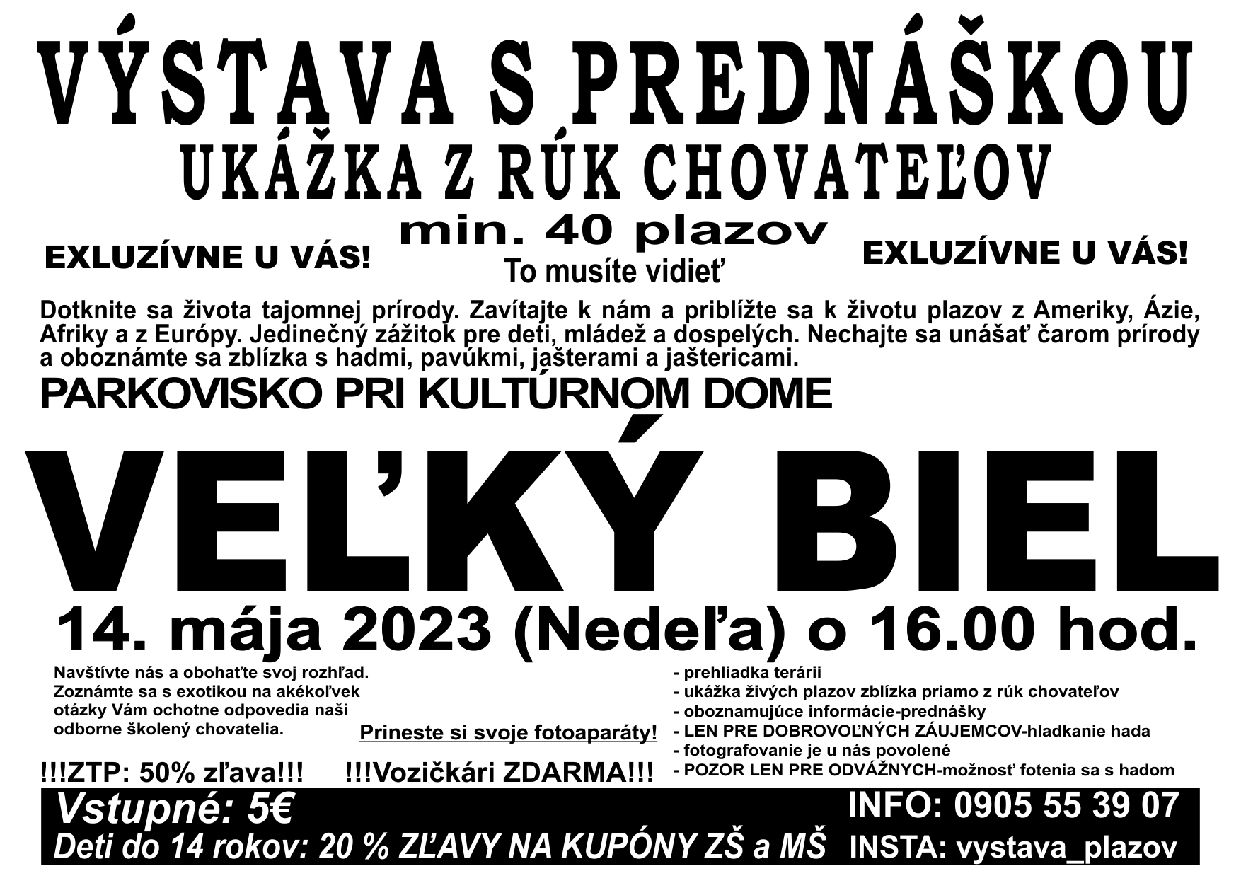 14.5.2023(nedeľa) o 16.00 hod. sa uskutoční výstava plazov s prednáškou.